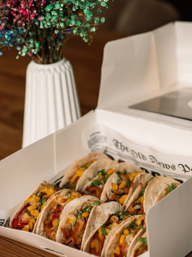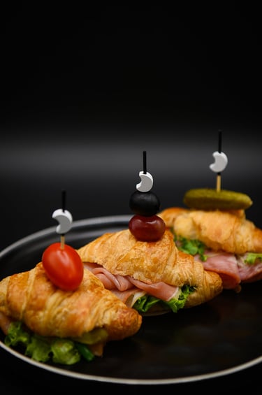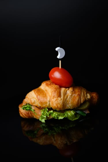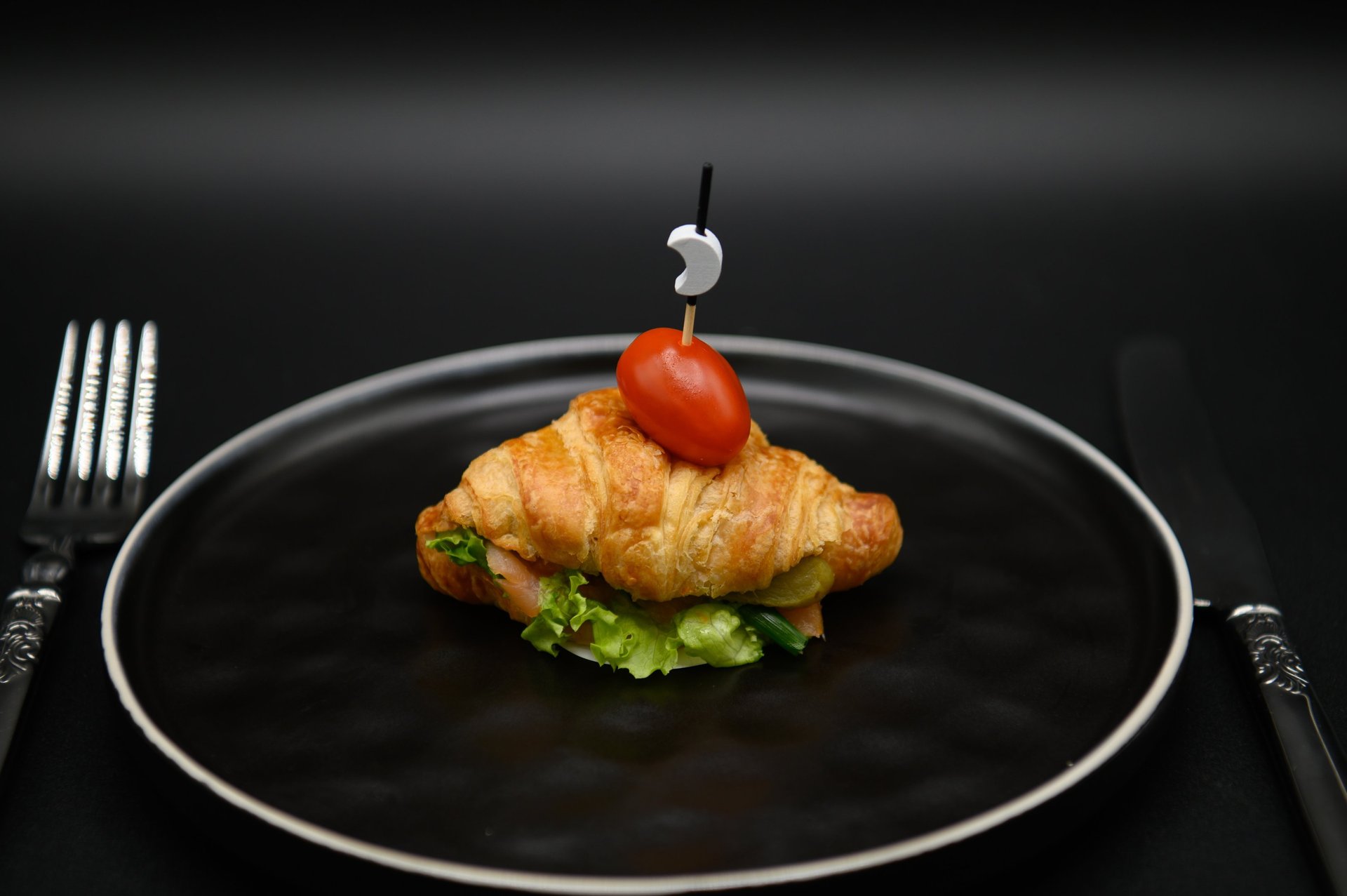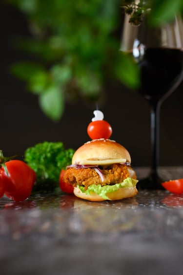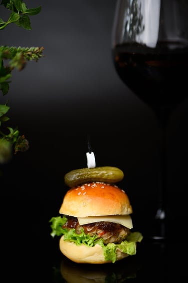 Mini mėsainis su kiaulienos ir daržovių paplotėliu, naminiais karamelizuotais svogūnais ir sūriu