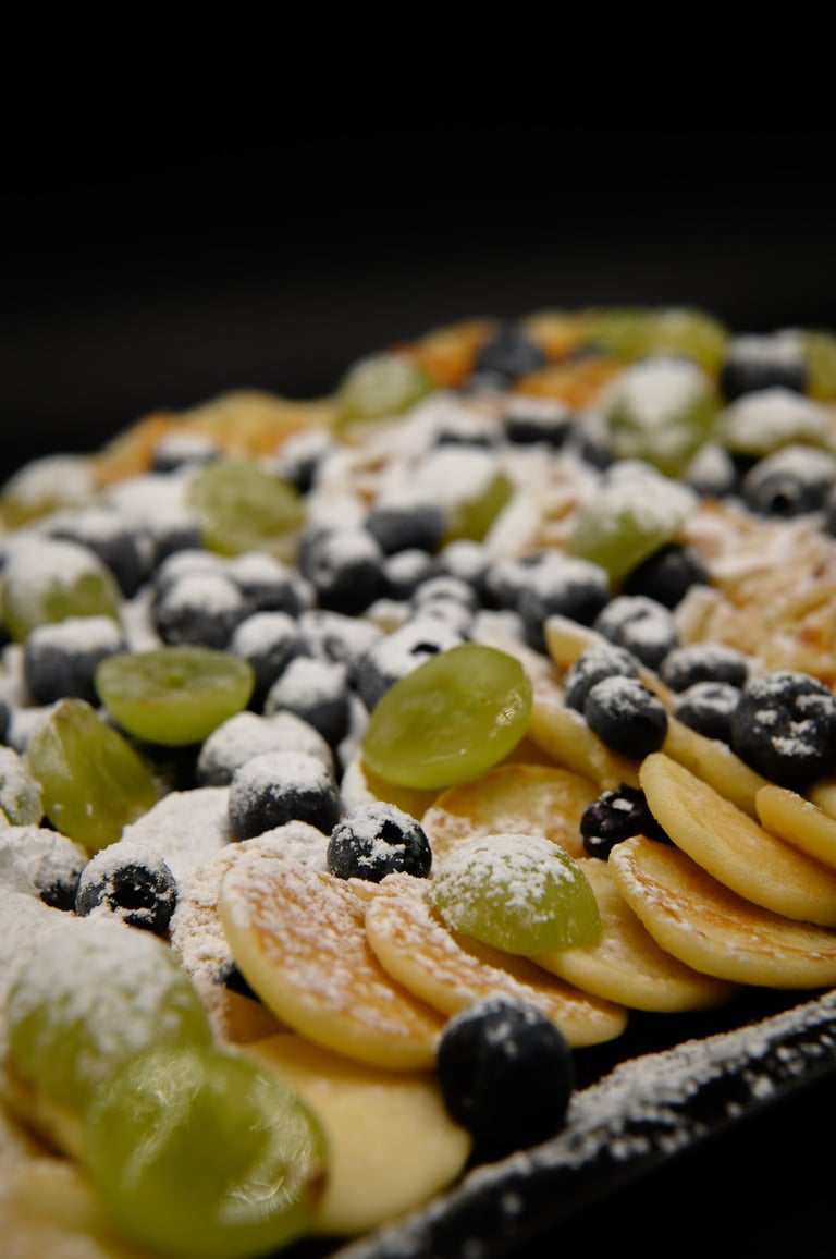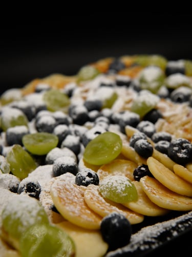 Mini blyneliai su sezoninėmis uogomis, cukraus pudra ir šokoladu