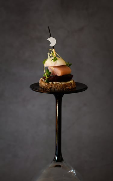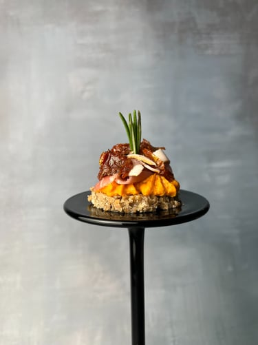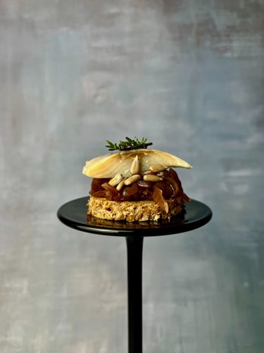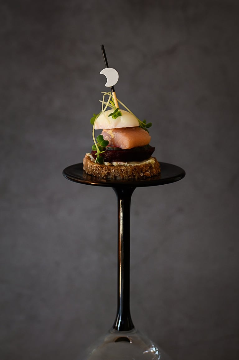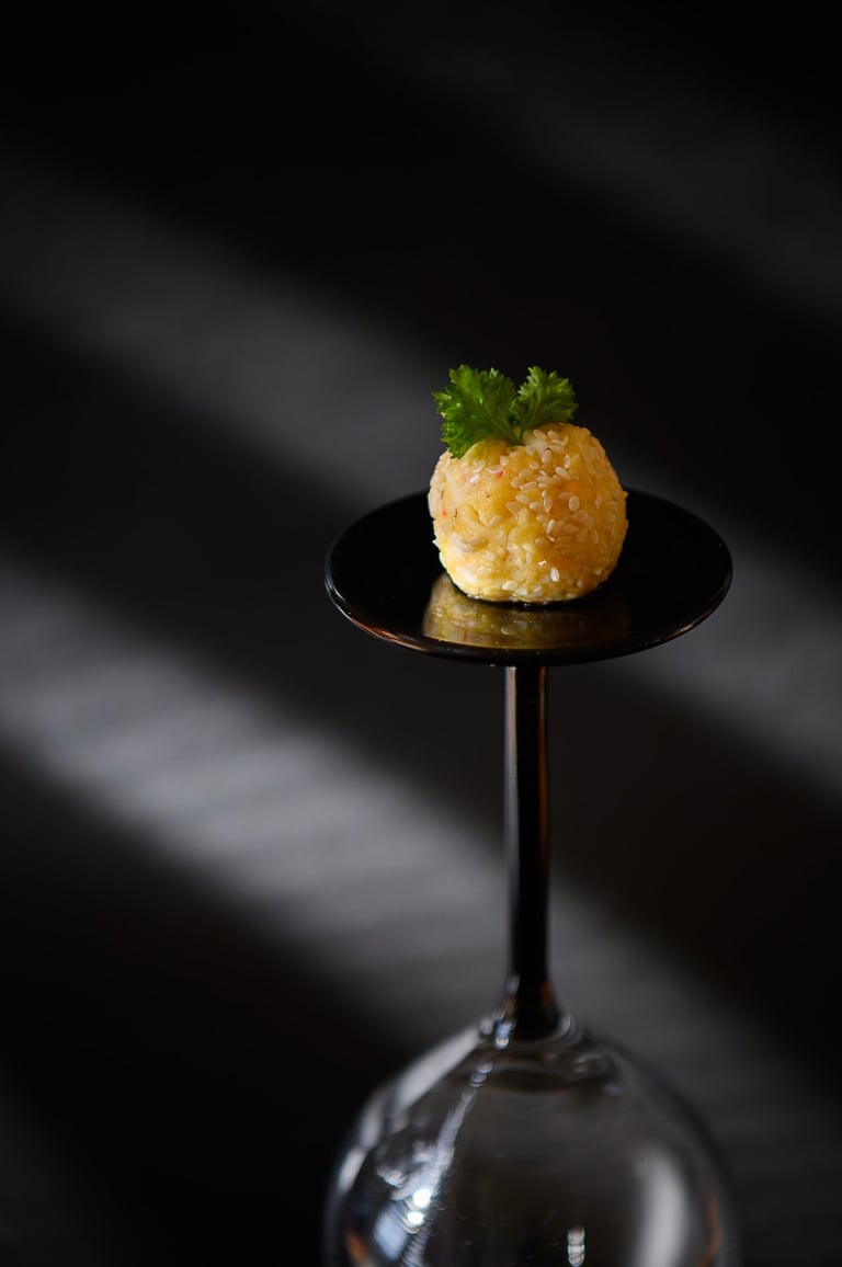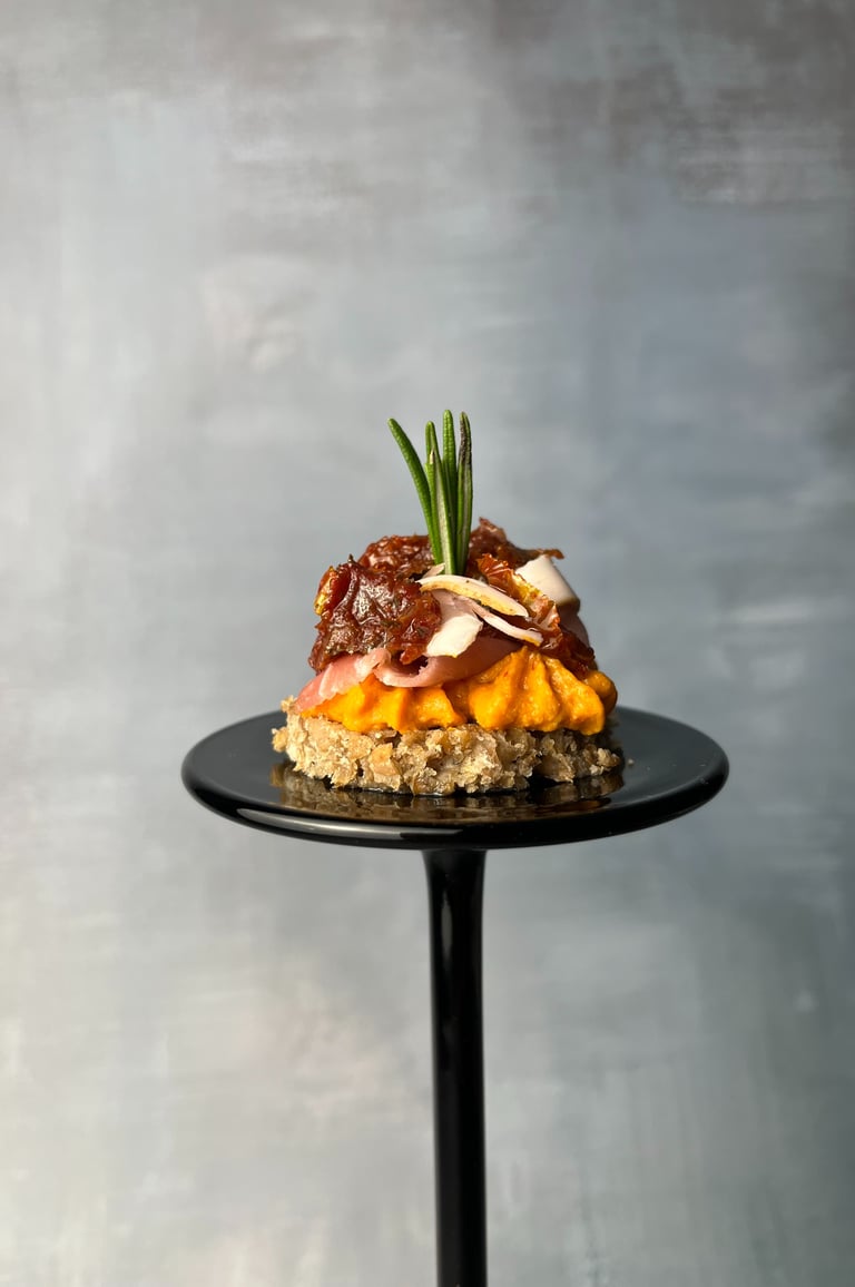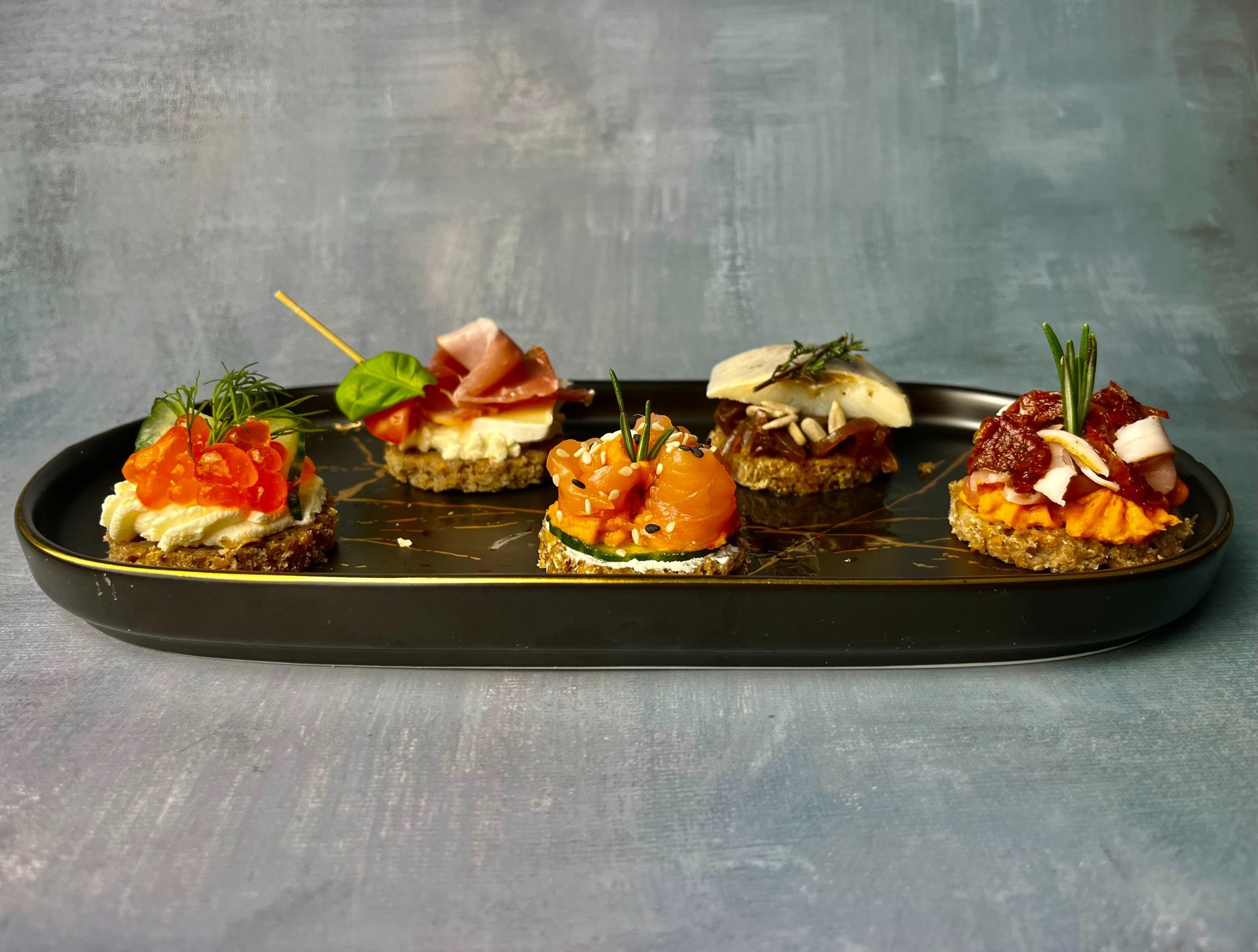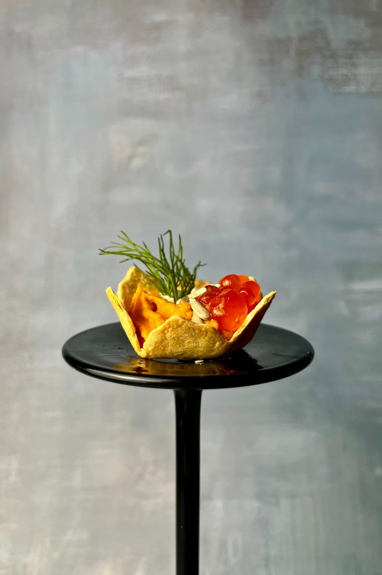 Krepšelis su paprikų humusu, varškės kremu ir dirbtiniais ikrais