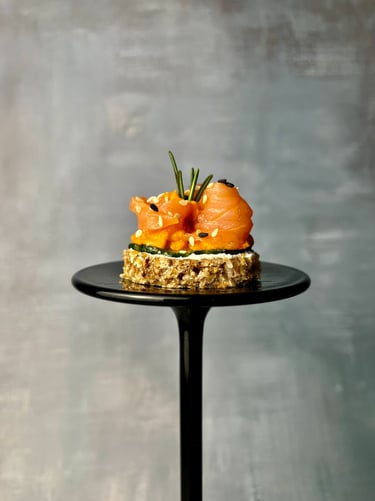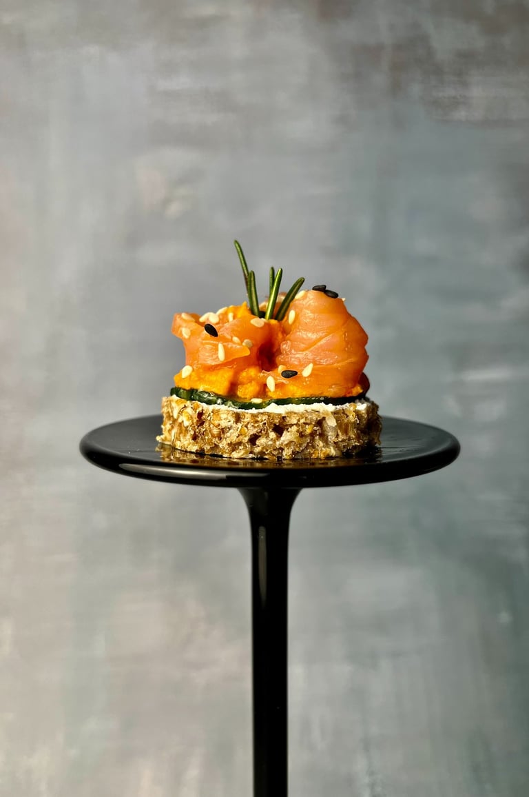 Sumuštinukas su varškės kremu, agurkais, lašiša ir sezamo sėklomis