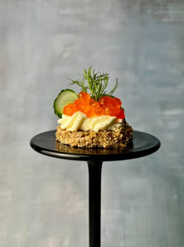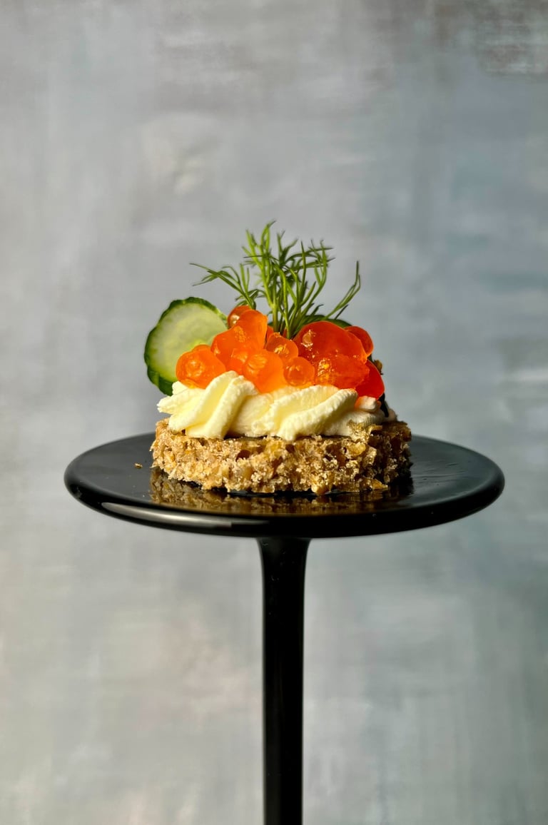 Sumuštinukas su varškės kremu, agurkais ir dirbtiniais raudonaisiai ikrais
