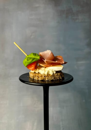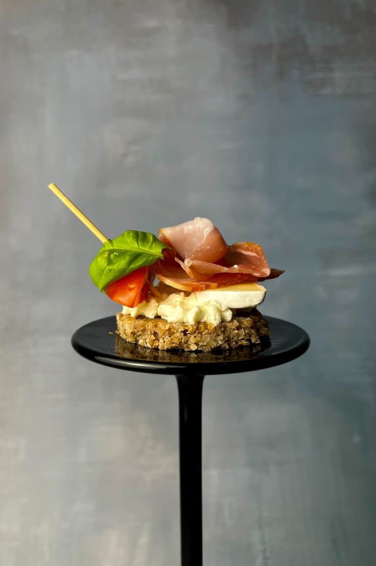 Sumuštinukas su varškės kremu, kumpiu, brie sūriu, pomidorais ir bazilikais