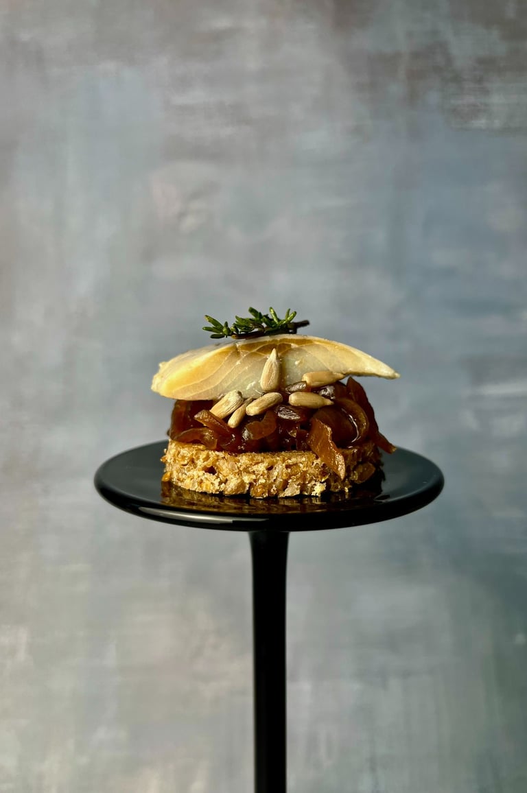 Sumuštinukas su naminiais karamelizuotais svogūnais, silke ir saulėgražomis