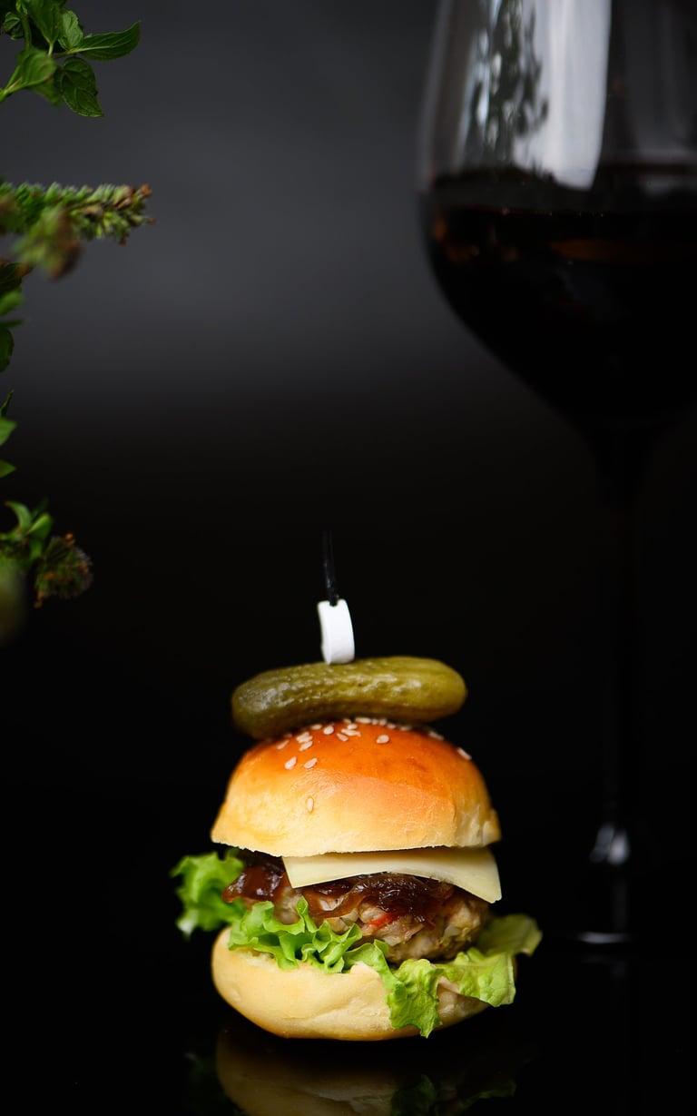 Mini mėsainis su kiaulienos ir daržovių paplotėliu, naminiais karamelizuotais svogūnais ir sūriu